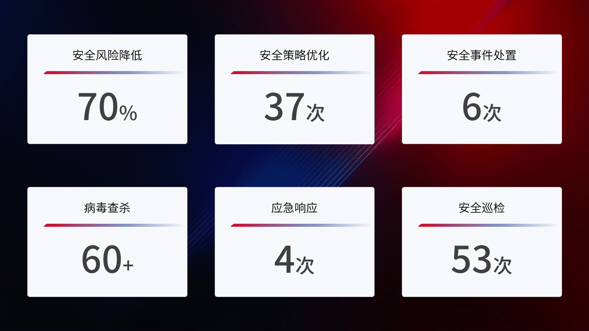 提供全面的安全事件报告体系,,包括处置报告、、周报、、季度和年度总结,,,结合持续监控,,,,帮助客户深入了解网络安全状况。。。。