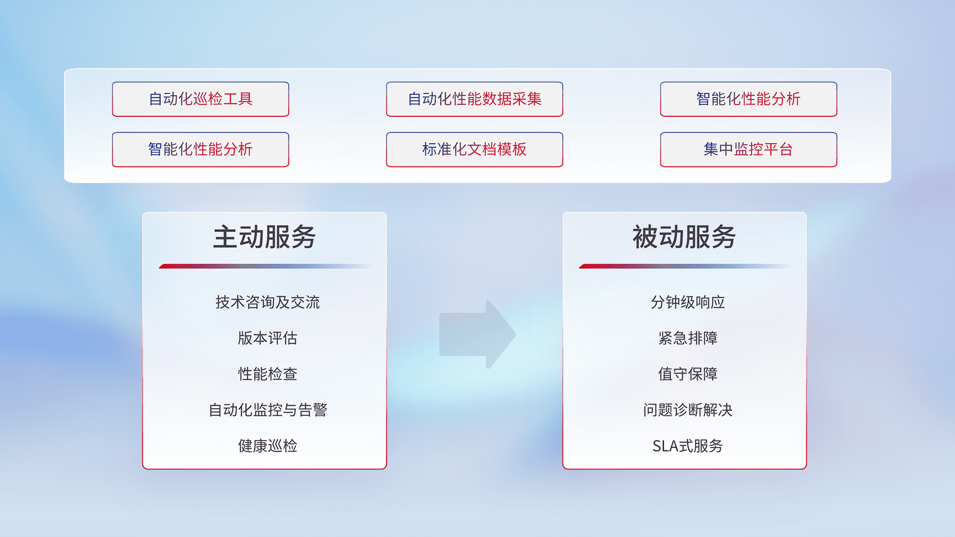 智能化工具和标准化文档,,保障服务质量,,,提供主动服务(包含技术咨询、、、版本评估、、、性能检查、、自动化监控与告警、、、健康巡检)和被动服务包含(分钟级响应、、紧急排障、、值守保障、、、问题诊断解决、、SLA服务)。。。。